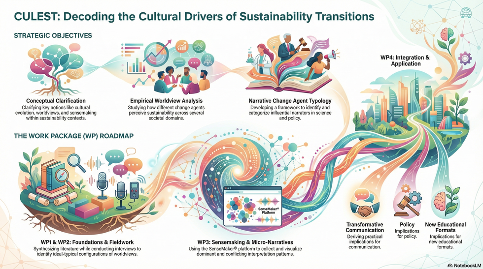 In WP1 werden Literatur und Messinstrumente zu kultureller Evolution, Weltbildern, Narrativen und Sensemaking im Kontext von Nachhaltigkeitstransformationen bzw. ‑transitionen systematisch synthetisiert. Auf dieser Basis entsteht ein integrierender theoretischer Rahmen, der unterschiedliche Forschungsstränge und Begriffe zusammenführt und konzeptionell schärft. Zudem wird eine Übersicht zentraler Konzepte, Operationalisierungen und Methoden erarbeitet, die als Referenz für die weiteren Arbeitspakete und für nachfolgende Forschung dienen soll.